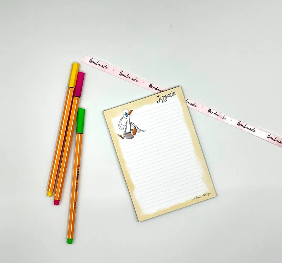 Egyedi grafikával készült, A6 méretű jegyzettömb. A jegyzettömb 25 lapból áll, a fejrésznél ragasztott. Karton hátlap merevítéssel.